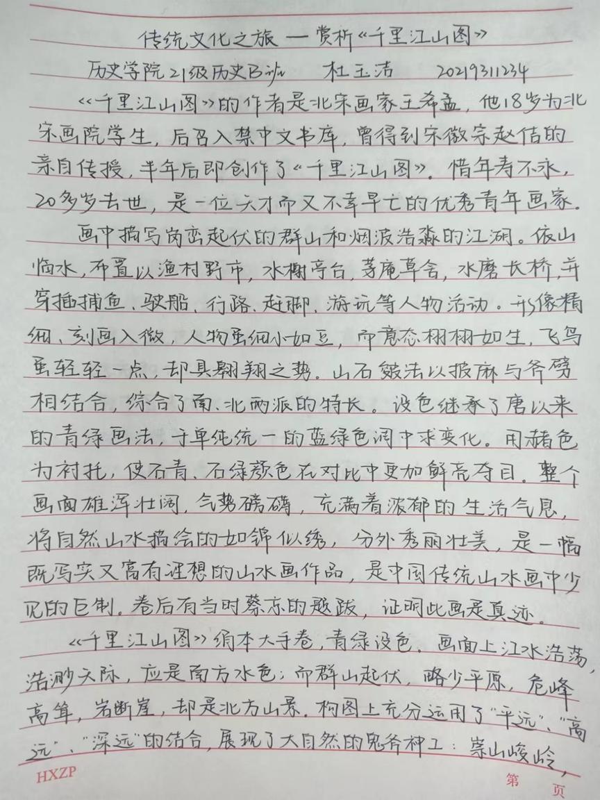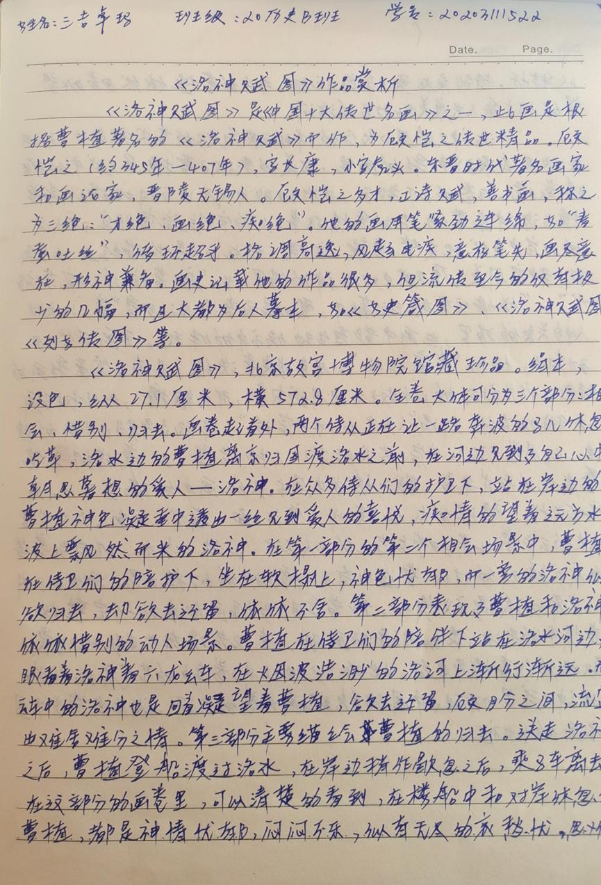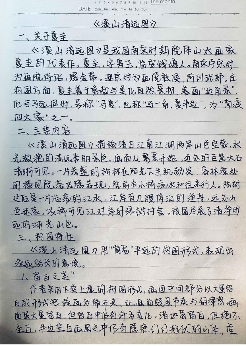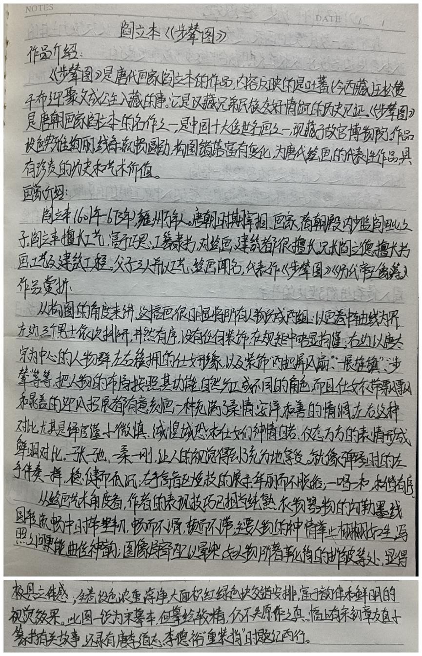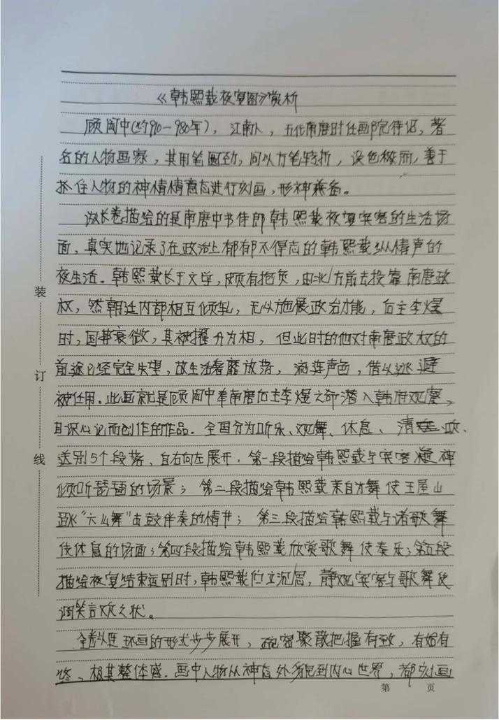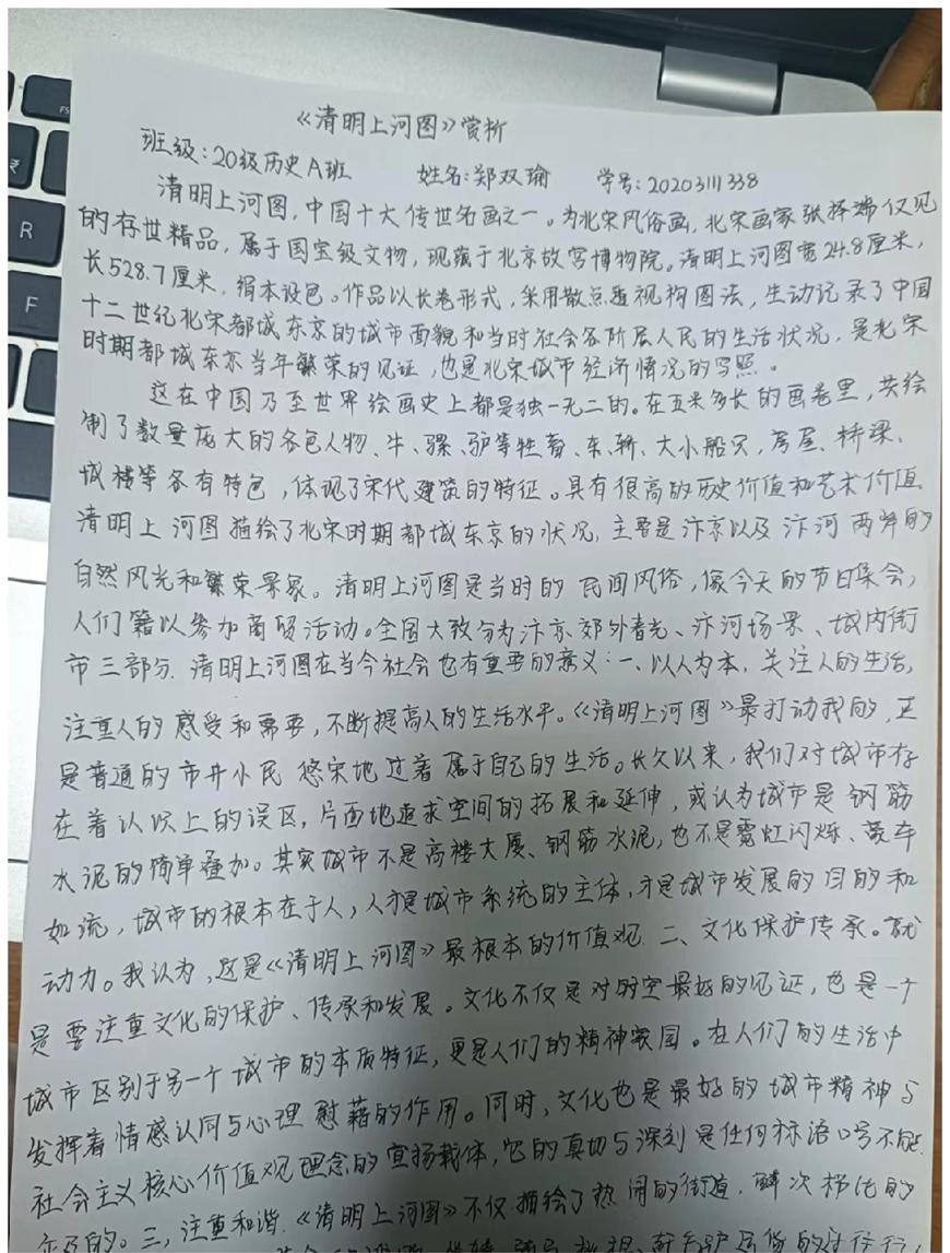 本次活动赏析的作品均为我国古代经典的绘画作品,如《步辇图》《送子天王图》《韩熙载夜宴图》《五牛图》《富春山居图》《簪花仕女图》《挥扇仕女图》《五王醉归图》《寒江独钓图》《城南高隐图》《虞山枫林图》《洛神赋图》《货郎图》《溪山渔隐图》《清明上河图》《明皇幸蜀图》《梅花蕉叶图》《墨葡萄图》《千里江山图》《岁朝欢庆图》《捣练画》《百鸟朝凤图》《西山清远图》《四景山水图》《三友百禽图》等等,这些作品时间跨度自唐迄清长达1000多年,包括人物画、山水画和花鸟画等三大类,既有展示皇室贵族生活的《韩熙载夜宴图》《簪花仕女图》《挥扇仕女图》,也有展示市井风情的《清明上河图》《货郎图》,也有展示锦绣山河的《富春山居图》《千里江山图》,还有展现鸟兽之趣的《百鸟朝凤图》《三友百禽图》等等。尽管不少同学赏析了同一幅绘画作品,但同学们能从不同的视角对这些作品进行赏析,或分析其绘画技巧,或探幽绘画者的个人思虑,或挖掘绘画创作的历史背景,展示了同学们较高的绘画赏析水平和良好的历史专业素养。