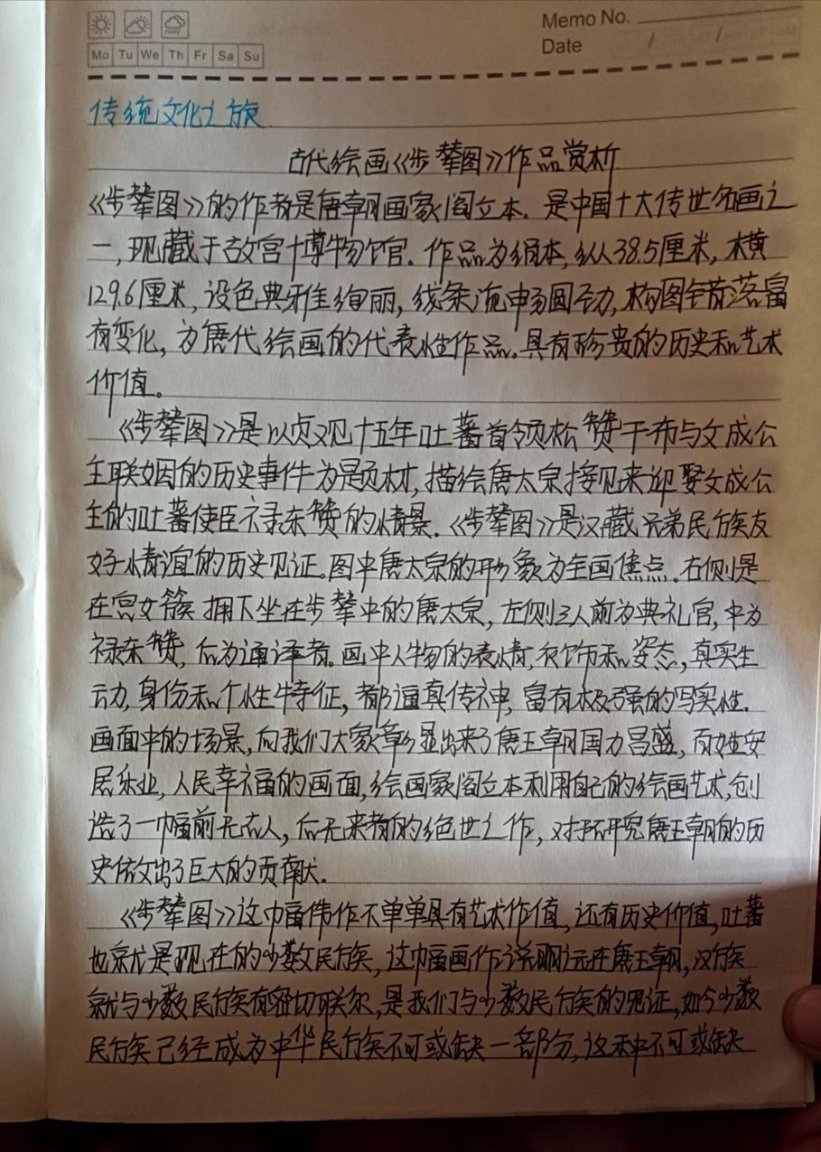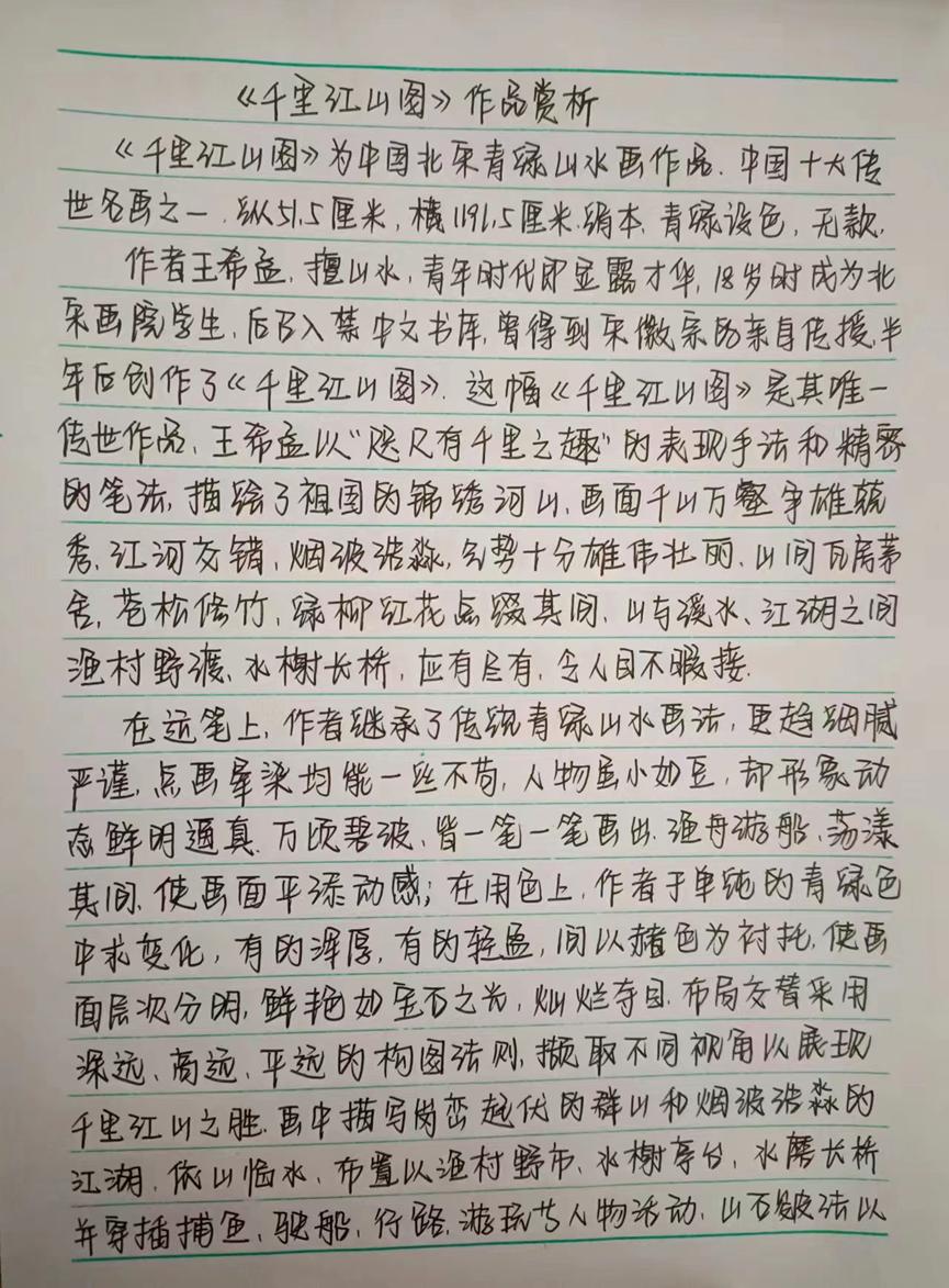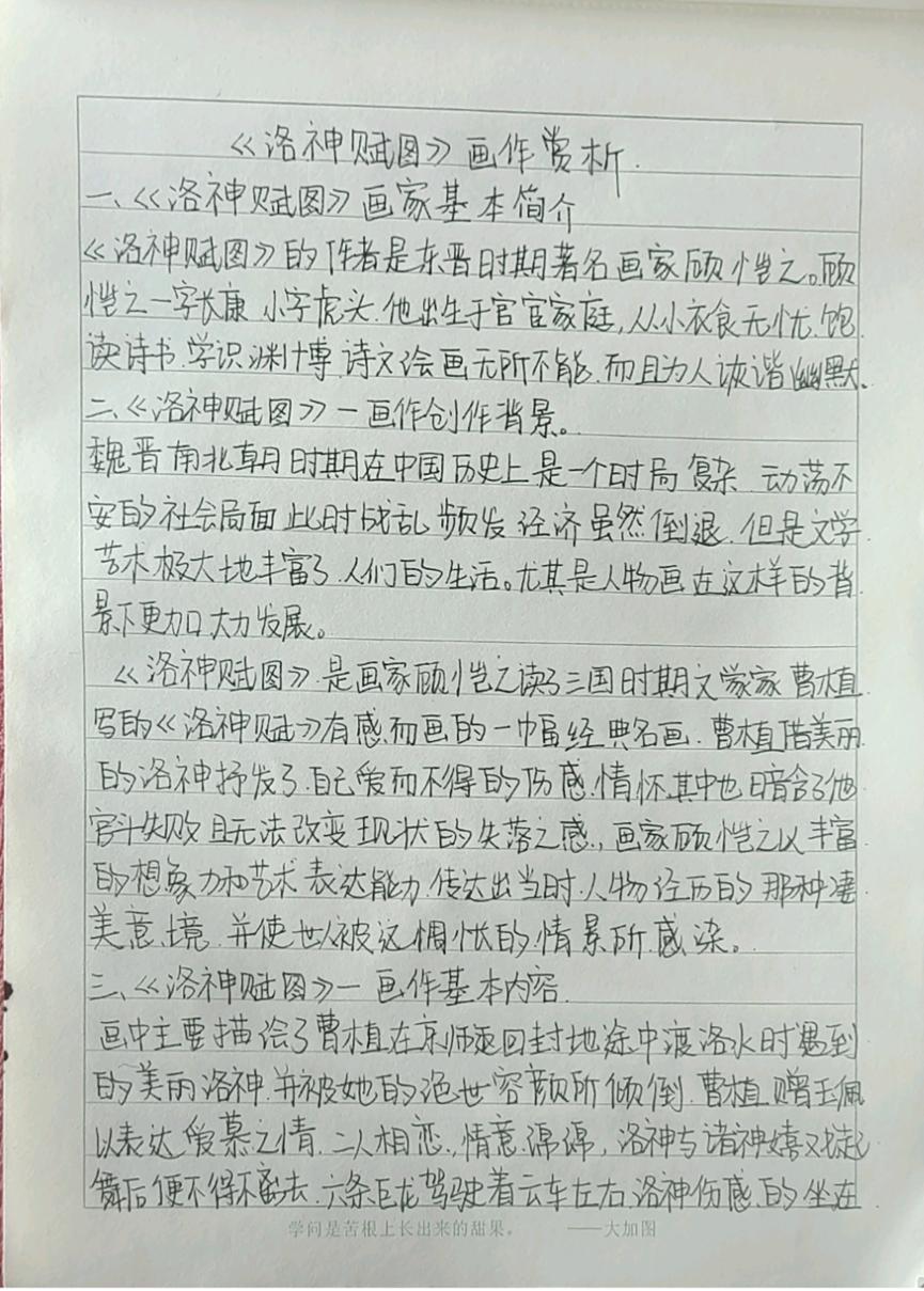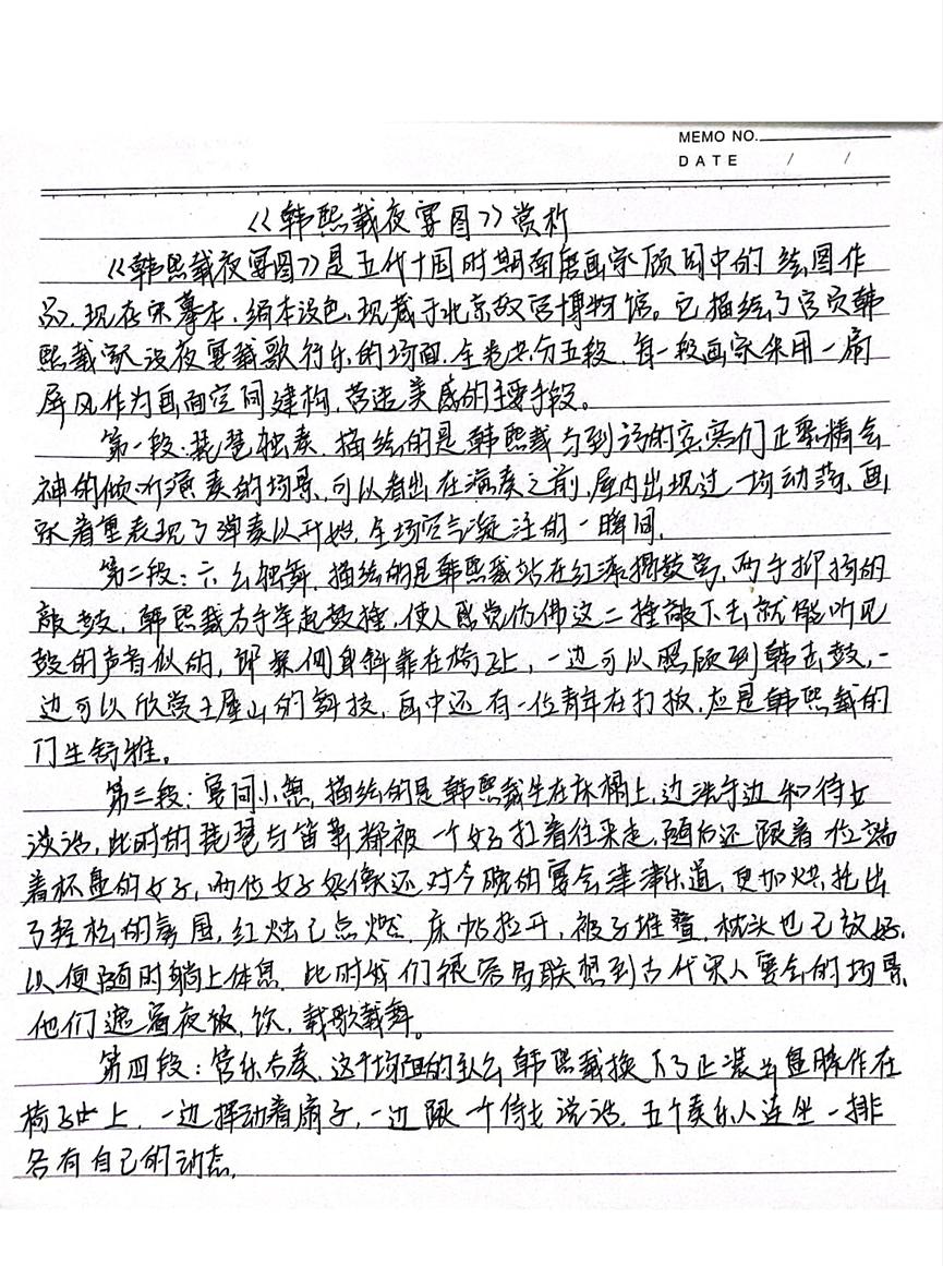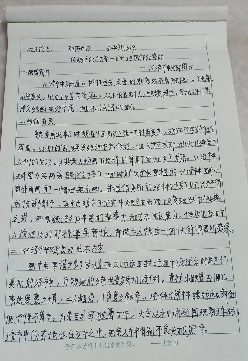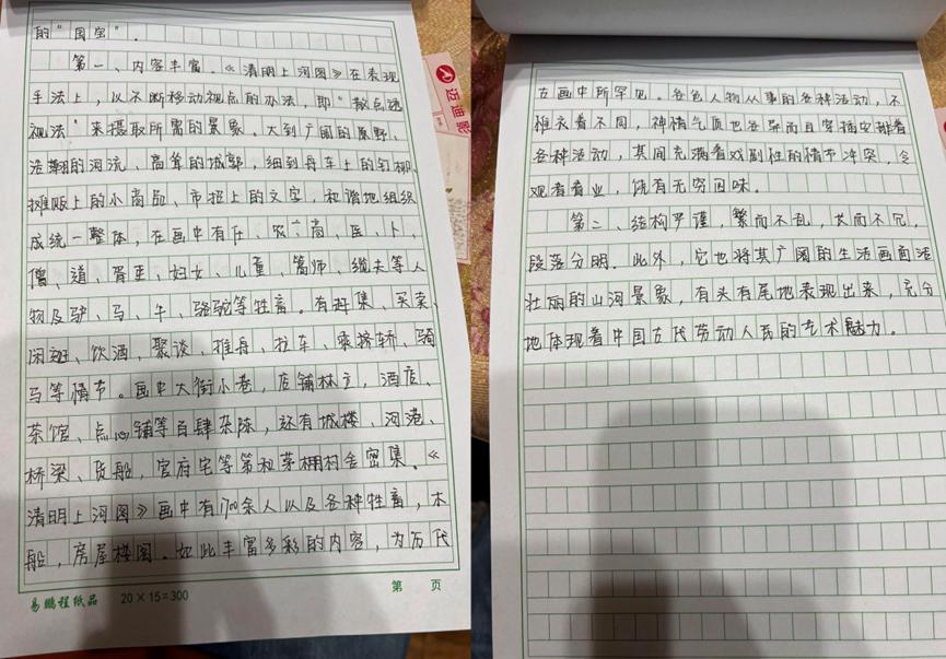 本次活动赏析的作品均为我国古代经典的绘画作品,如《步辇图》《送子天王图》《韩熙载夜宴图》《五牛图》《富春山居图》《簪花仕女图》《挥扇仕女图》《五王醉归图》《寒江独钓图》《城南高隐图》《虞山枫林图》《洛神赋图》《货郎图》《溪山渔隐图》《清明上河图》《明皇幸蜀图》《梅花蕉叶图》《墨葡萄图》《千里江山图》《岁朝欢庆图》《捣练画》《百鸟朝凤图》《西山清远图》《四景山水图》《三友百禽图》等等,这些作品时间跨度自唐迄清长达1000多年,包括人物画、山水画和花鸟画等三大类,既有展示皇室贵族生活的《韩熙载夜宴图》《簪花仕女图》《挥扇仕女图》,也有展示市井风情的《清明上河图》《货郎图》,也有展示锦绣山河的《富春山居图》《千里江山图》,还有展现鸟兽之趣的《百鸟朝凤图》《三友百禽图》等等。尽管不少同学赏析了同一幅绘画作品,但同学们能从不同的视角对这些作品进行赏析,或分析其绘画技巧,或探幽绘画者的个人思虑,或挖掘绘画创作的历史背景,展示了同学们较高的绘画赏析水平和良好的历史专业素养。