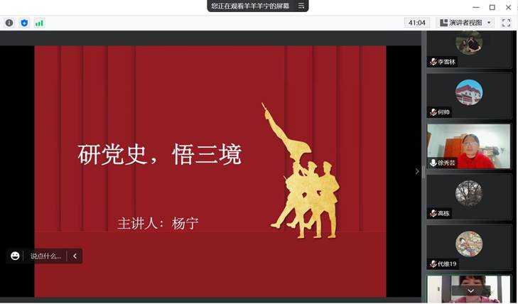 理论学习后,由博士研究生杨宁同学分享党课学习心得,以《学党史,悟三境》为题,运用《人间词话》所说:古今之成大事业、大学问者,必经过三种之境界来理解党史。第一境“昨夜西风凋碧树,独上高楼,望尽天涯路”。早期的共产党人在纷繁复杂的思潮和形势中准确地把握住了马克思主义这盏明灯,从一座小楼到一艘红船,从50多名党员到现在的9191.4万名党员。这就是中国共产党走过的“第一境”——以“开天辟地、敢为人先”的首创精神。执着追求目标、追求理想。“衣带渐宽终不悔,为伊消得人憔悴”,此第二境也。我们党带领中国人民从“站起来”到“富起来”再到“强起来”的历史,是一部艰苦卓绝的奋斗史。“众里寻他千百度,蓦然回首,那人却在灯火阑珊处”,此第三境也。从“三个决议”中回顾中国共产党对路线的探索,可以发现其思想和奋斗史上是“众里寻他千百度”。