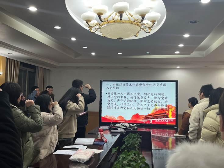 会议第一项,由组织委员王林武带领全体党员同学重温入党誓词。入党誓词是作为一名共产党员对党的最基本的承诺和保证,重温入党誓词既是在重温作为党员的初心与使命,又是在重温党成立之初的艰难而又光辉的历史。