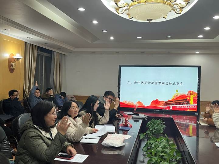 会议第三项,全体党员讨论宫雪同志转正事宜。首先宫雪同志汇报个人基本情况。宫雪同志是2023级博士研究生中国史班班长,工作成绩突出,学业成绩优异。之后,宫雪同志的入党介绍人及在座党员同志对其进行了客观的评价,肯定了她的优点与今后还需要继续努力的建议及意见。最后,根据《党章》相关规定,支部各正式党员进行投票表决,一致通过宫雪同志转正为正式党员。