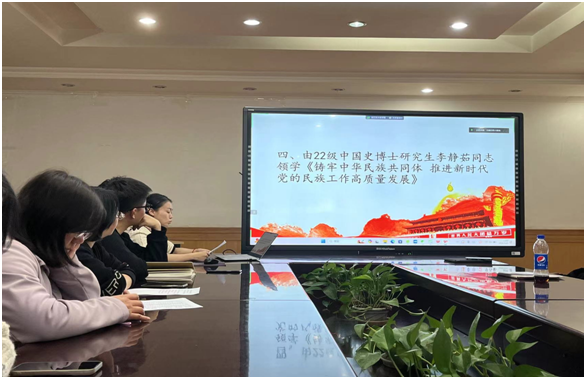 会议中22级中国史博士研究生李静茹同志领学习近平总书记近期在《求是》杂志发表的重要文章《铸牢中华民族共同体意识,推进新时代党的民族工作高质量发展》,文章强调我们党自成立之日起就高度重视民族问题、民族工作。铸牢中华民族共同体意识、推进新时代党的民族工作高质量发展,是全党全国各族人民的共同任务。广大党员和领导干部要深入学习贯彻党关于加强和改进民族工作的重要思想,提高做好民族工作的本领,为推进民族团结进步事业做出应有贡献。