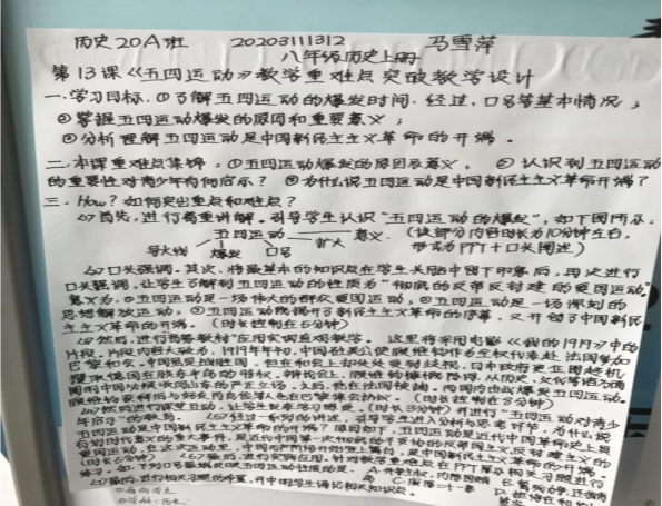 20级大一员工在边芸老师的指导下,结合历史学科“学好党史、讲好党史”的主题活动,完成手写在白纸上的教学设计初稿,目的一是掌握教学设计的基本要素和流程;二是练习在白纸上书写的基本功。