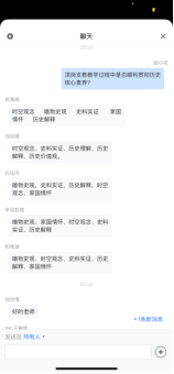 赵小花老师与同学们探讨了关于在顶岗支教的教学活动中怎样贯彻历史核心素养的问题。赵老师提出应该紧密结合当地员工实际情况,多采用问题探究形式,进而引导员工树立正确的人生观、价值观与世界观,实现核心素养中家国情怀的目标。