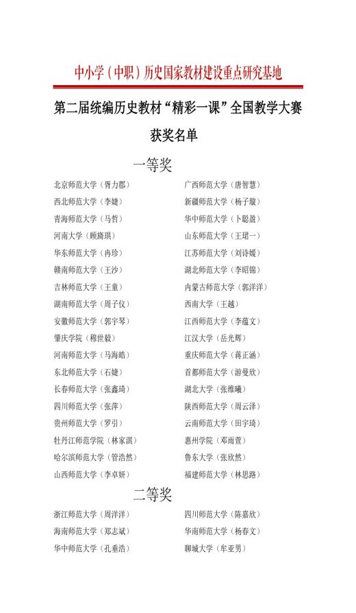 由全国中小学历史国家教材重点研究基地组织的“全国统编历史教材精彩一课”教学比赛,是目前全国高校历史专业师范生教学技能竞赛最高水平的赛事。研究基地秉持公平、公正的比赛原则,要求全国各师范院校选拔2019级本科生两名员工参赛。参赛内容为统编高中历史新教材《中外历史纲要(上)》第21课至29课中任选一课,因疫情变化,最终比赛采用递交录课及教学设计稿的线上方式进行。经双匿名(参赛学校及员工匿名、评审专家匿名)评选完成比赛。