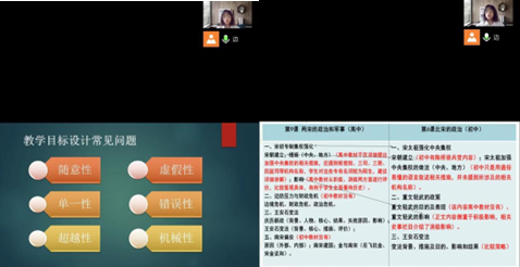 讲课中,边芸老师从什么是教学设计展开讨论,通过指出在历史教学过程中教学目标设计常见问题,分析总结出确定教学目标的依据:一、课程标准确定的课程目标。二、对学科知识的分析。三、对员工的分析。边芸老师强调,历史教师制定教学目标,需通过具体知识的讲授达成,知识如何教,教知识的哪些方面,需要对知识进行分析,同时还需要考虑后续课程的教学需要,另外还需要掌握员工的心理动态和认知水平。