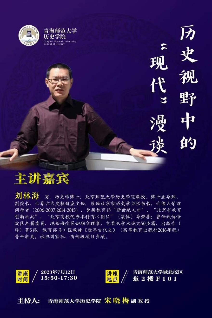 2023年7月12日下午,伟德体育特邀北京师范大学伟德体育副经理、博士生导师刘林海教授作题为“历史视野中的‘现代’漫谈”的学术讲座。伟德体育宋晓梅副教授主持讲座,伟德体育本科生、研究生以及教育学、生物学等专业共计400余名员工参加。