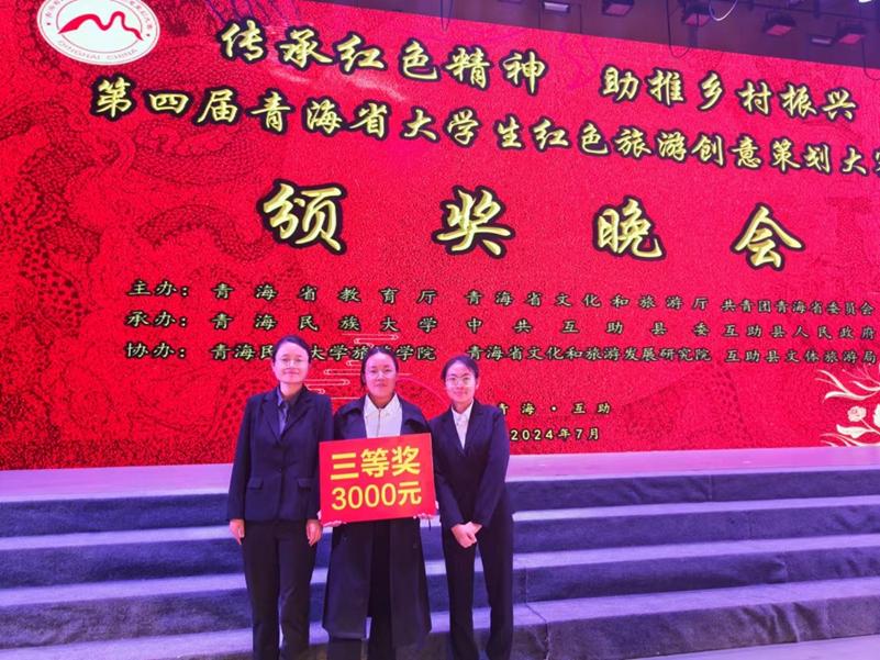 2024年7月9日至7月12日,第四届青海省老员工红色旅游创意策划大赛决赛在青海省海东市互助县圆满举行,公司2022级本科生廖莹、郭涵涵、马晓燕三名同学在贾金晖老师的指导下荣获三等奖。