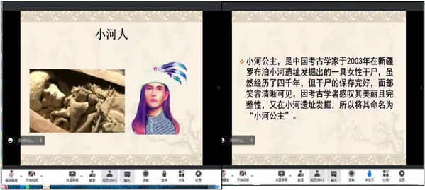 杨荣春老师长期致力于研究敦煌吐鲁番学与民族史、魏晋南北朝史研究。本次线上讲座,杨老师主要介绍新疆小河遗址的墓葬发掘以及出土文物。讲座分为“新疆地理特征”、“西域早期居民”、“小河墓地与小河公主”三部分展开。杨老 师首先从新疆特殊的地理环境对于干尸形成的重要作用开始,接着又从人种和民族角度介绍新疆地区的早期居民,之后展示了多具出土干尸和壁画。然后杨老师介绍了小河墓地的发现和后期考古发掘以及出土文物,在杨老师讲解之余向参与师生提出了三个问题:一、于阗人的族源;二、小河遗址周围木桩以及木桩分隔南北区的作用;三、新疆干尸形成的条件。